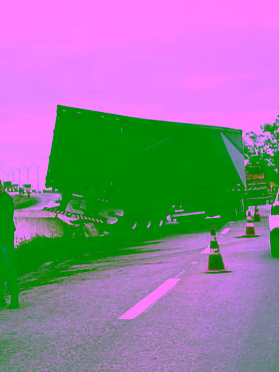 Carreta fica pendurada em viaduto após colisão na Fernão Dias